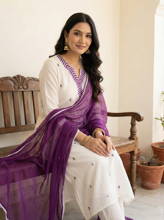 Women Stylish Purple Embroidered pure cotton slim fit kurta set
